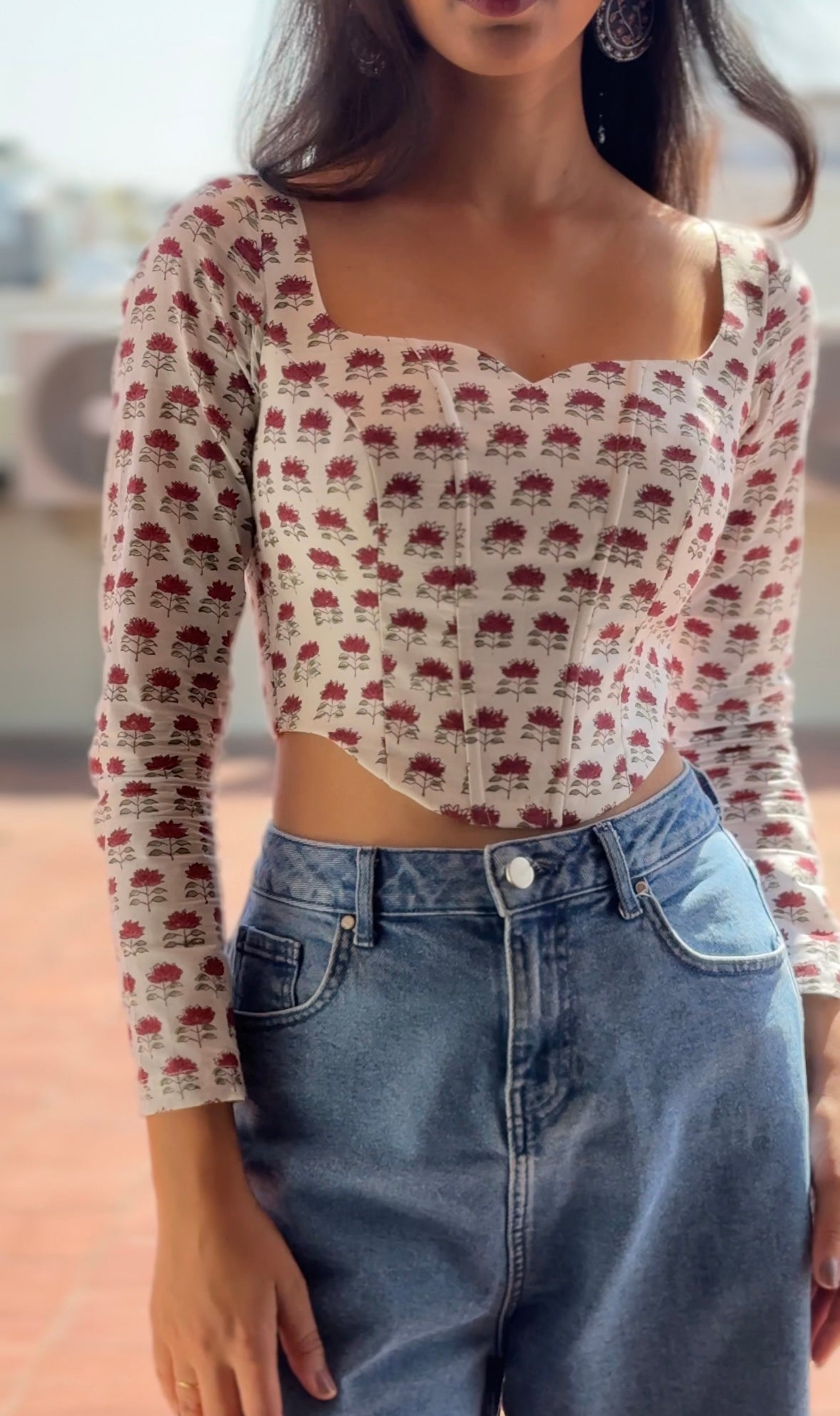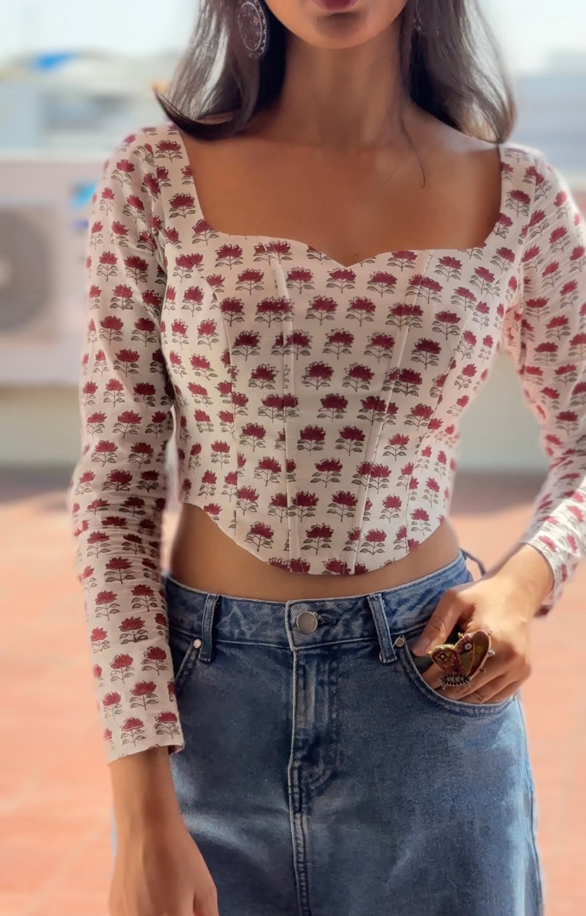 This corset top with full sleeves is crafted from printed cotton fabric. It is a structured corset top with minimal stretch. It features boning details and a back zipper.