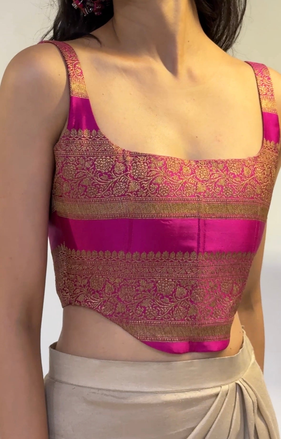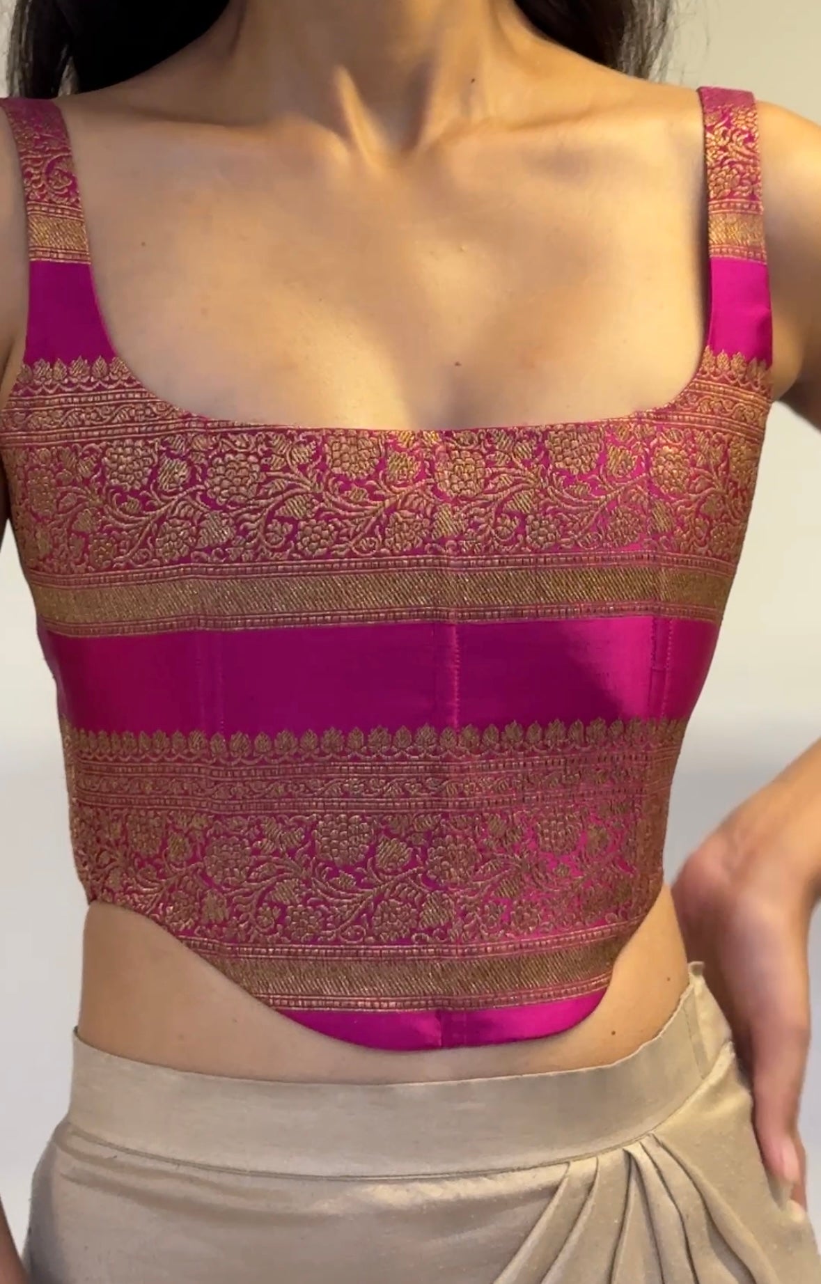 This corset top is crafted from satin silk brocade fabric featuring woven zari border all over. It is a structured corset top with minimal stretch. It features boning details and a back zipper.