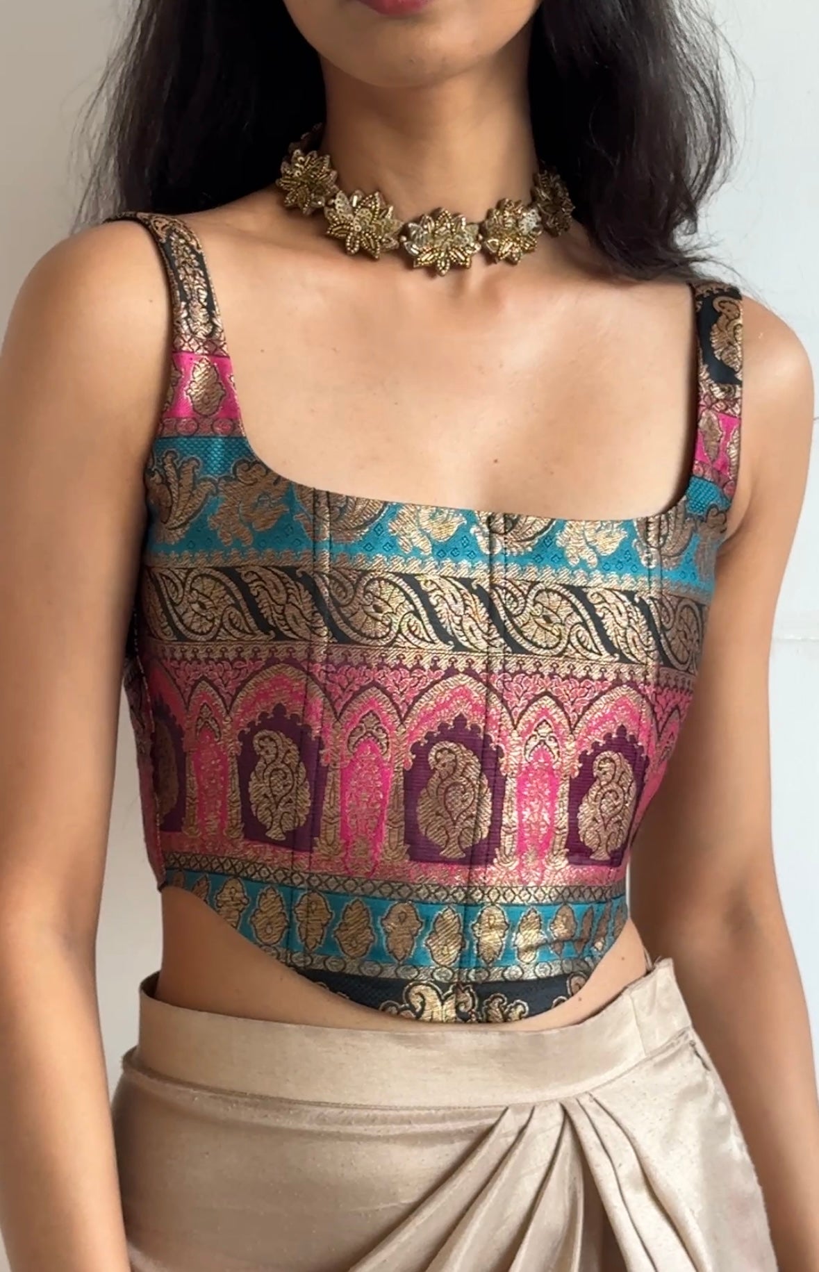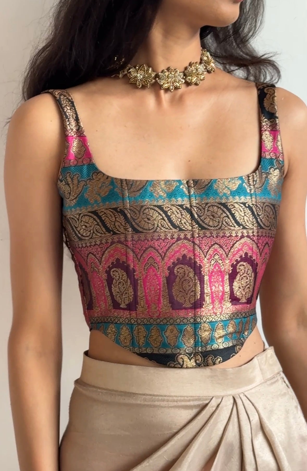 This corset top is crafted from multi colored brocade fabric. It is a structured corset top with minimal stretch. It features boning details and a back zipper.