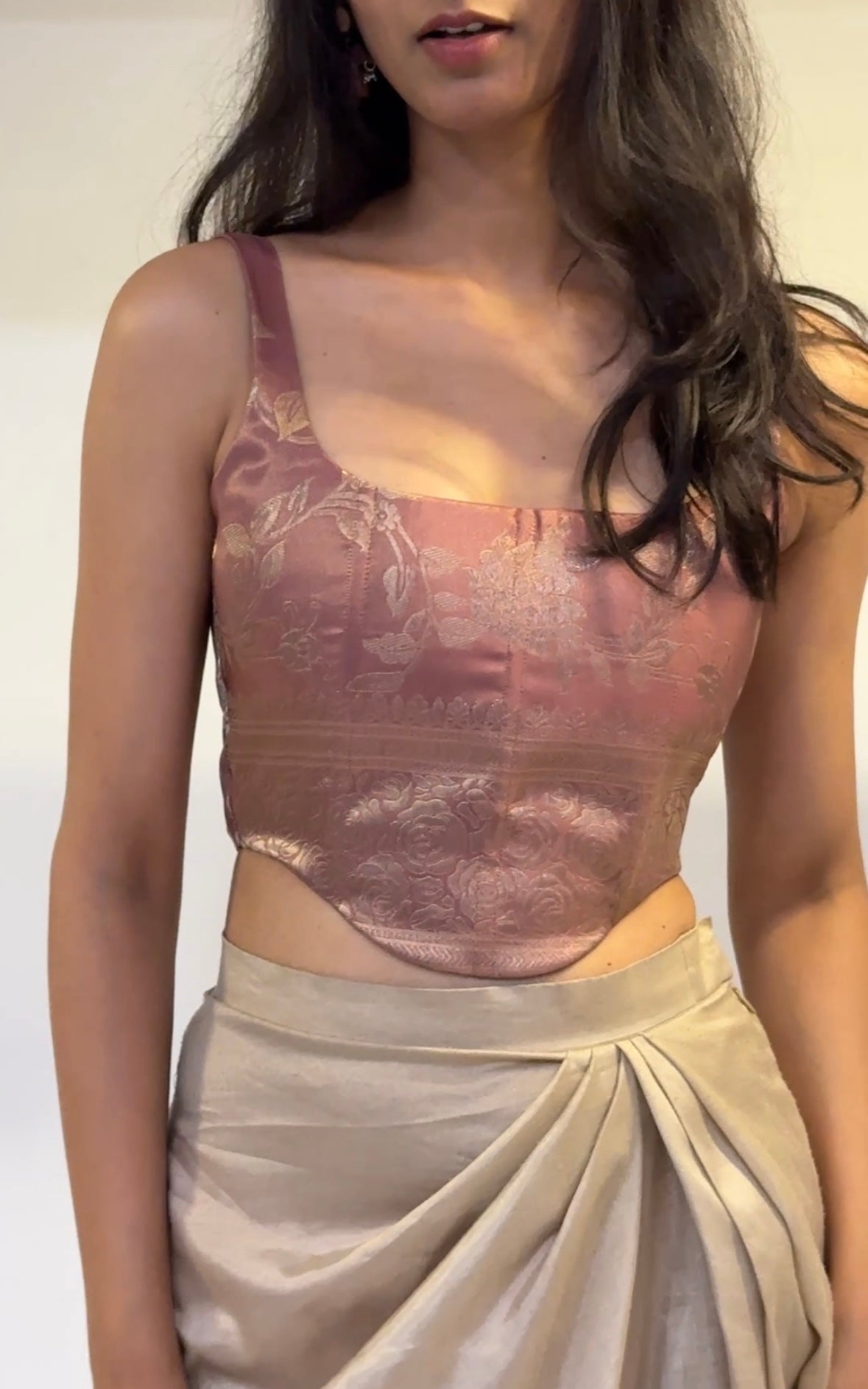 This corset top is crafted from mauve blended silk fabric featuring border at hem. It is a structured corset top with minimal stretch. It features boning details and a back zipper.