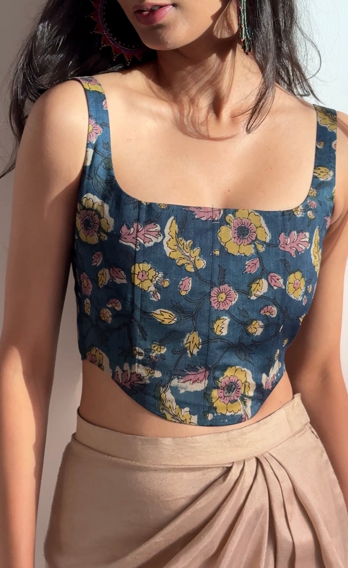 This corset top is crafted from hand block printed chanderi fabric. It is a structured corset top with minimal stretch. It features boning details and a back zipper.