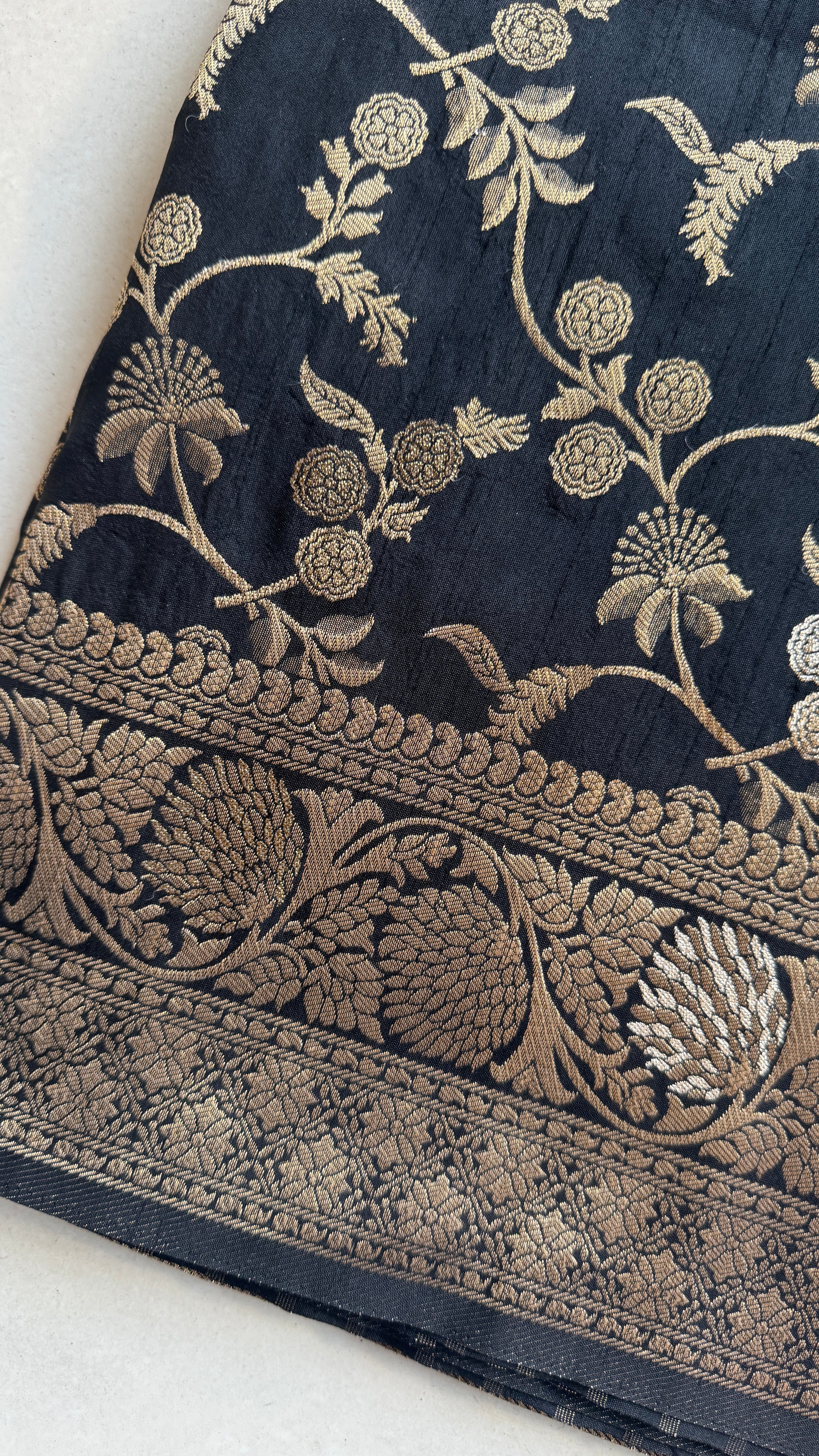 This corset top is crafted from black brocade fabric featuring border at hem. It is a structured corset top with minimal stretch. It features boning details and a back zipper.