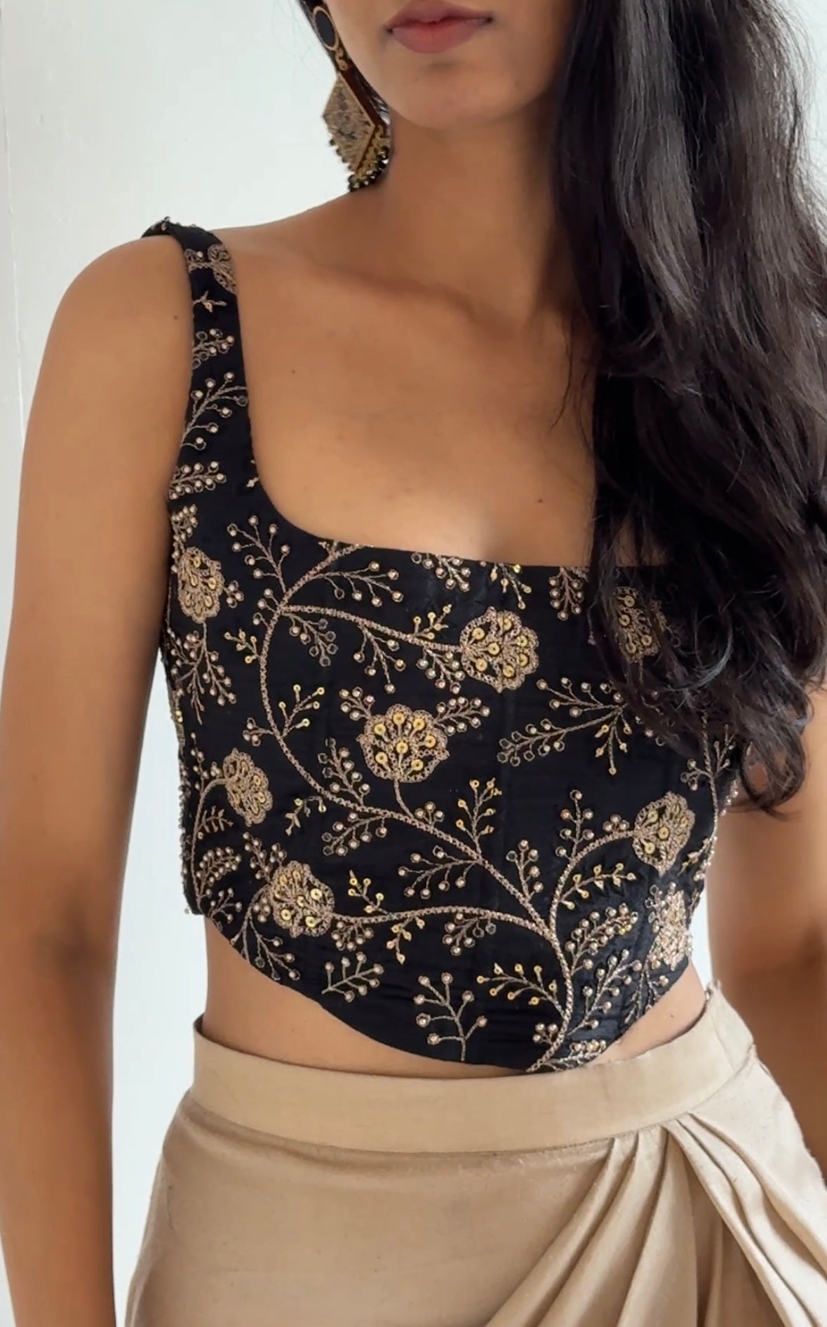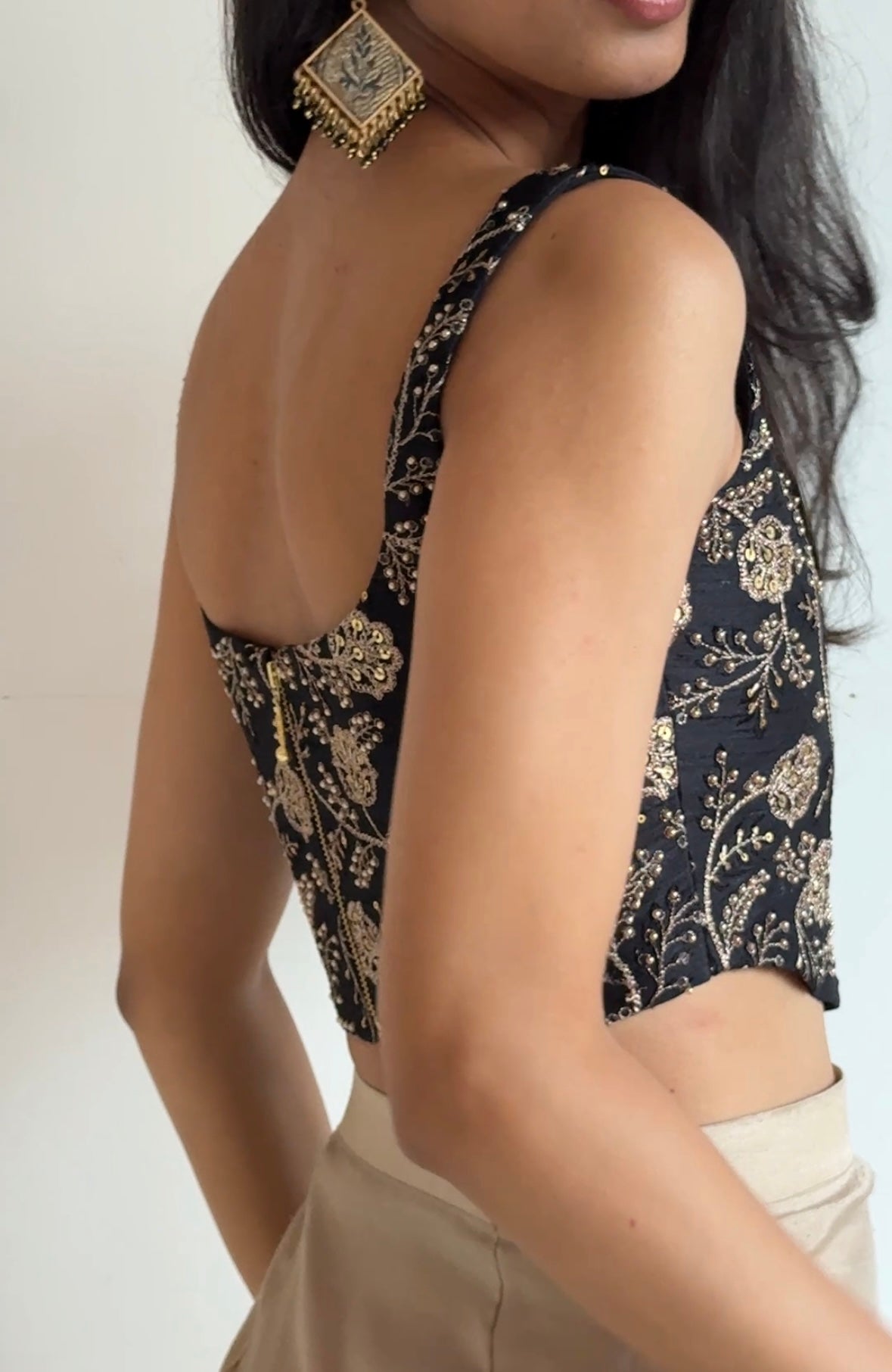 This corset top is crafted from embroidered raw-silk fabric. It is a structured corset top with minimal stretch. It features boning details and a back zipper.