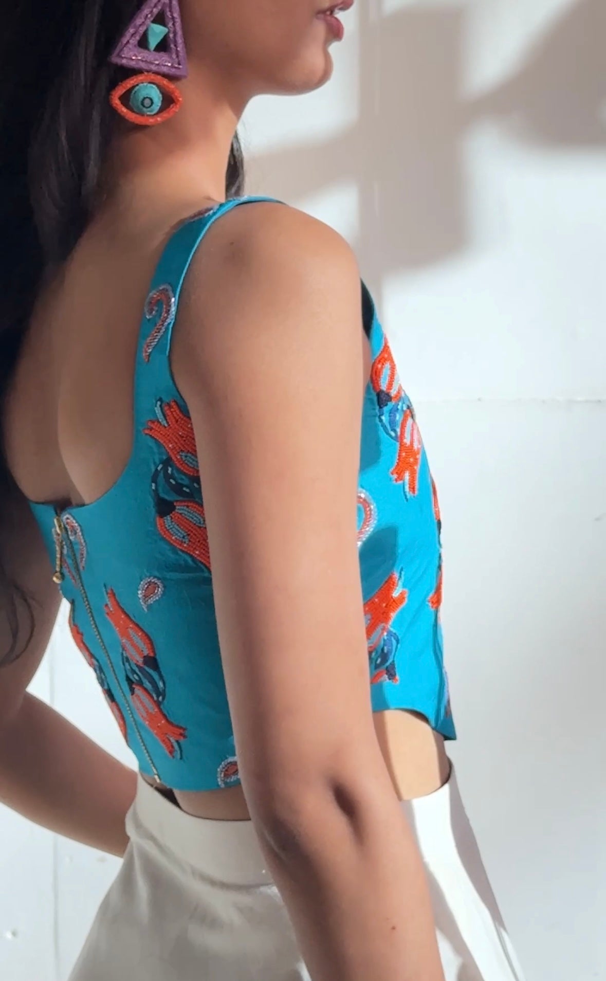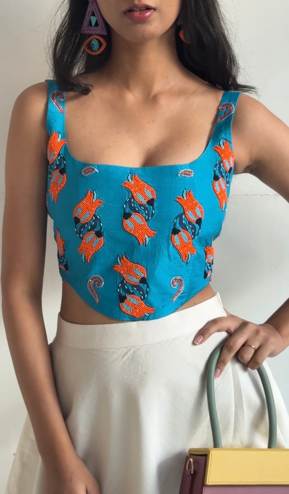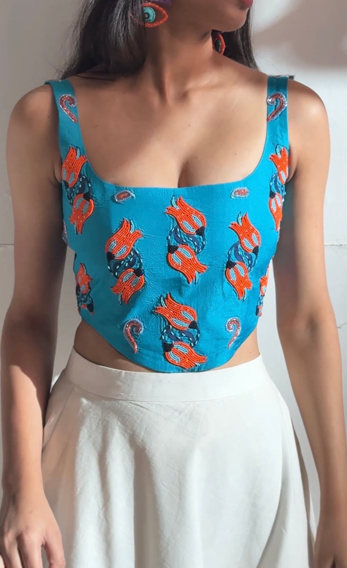 This structured corset is crafted from hand embroidered silk fabric. It has boning in the front, with tie-up straps and back zipper. It does not have pads.