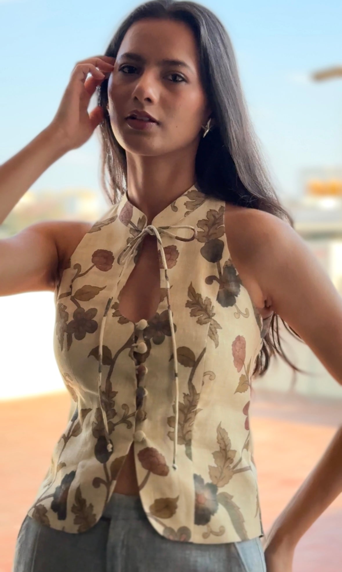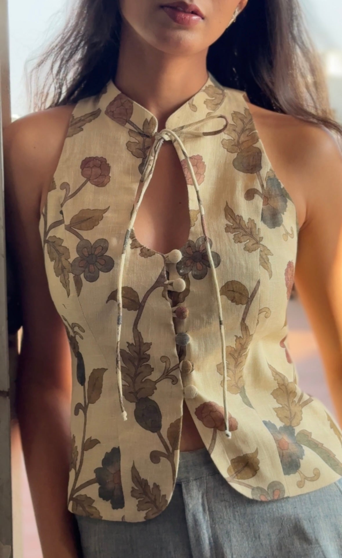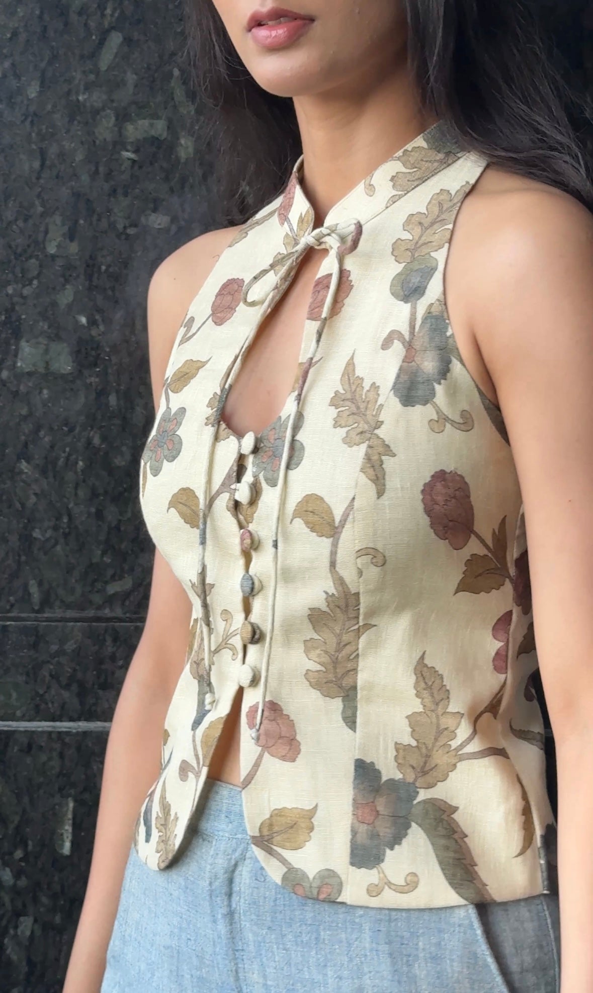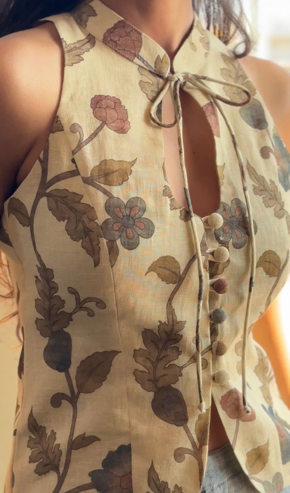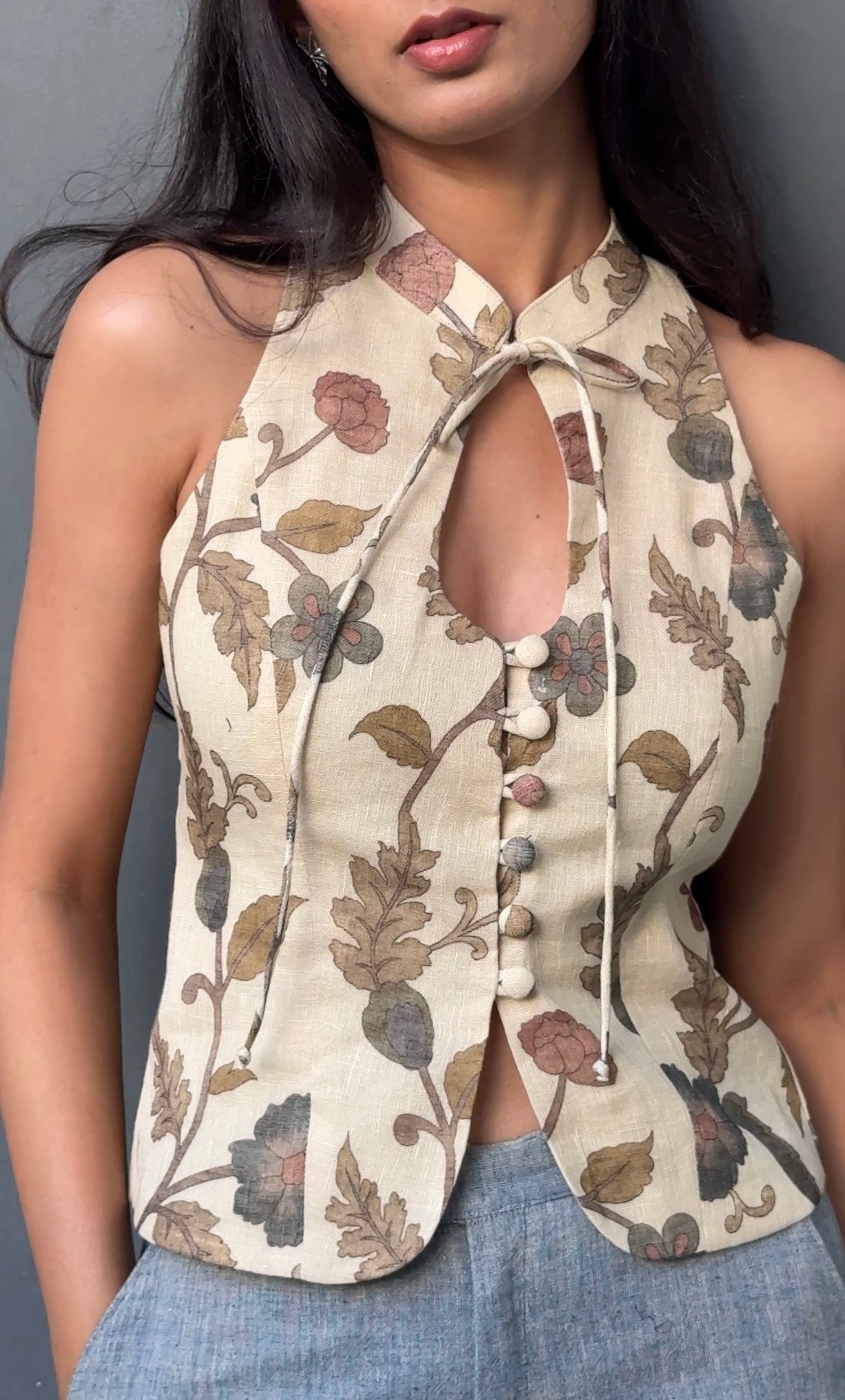 This halter sleeveless top is crafted from Kalamkari printed cotton linen fabric. It features structured fit with collared key hole design on the neckline. It has front open button closure with slit. It does not come with pads.