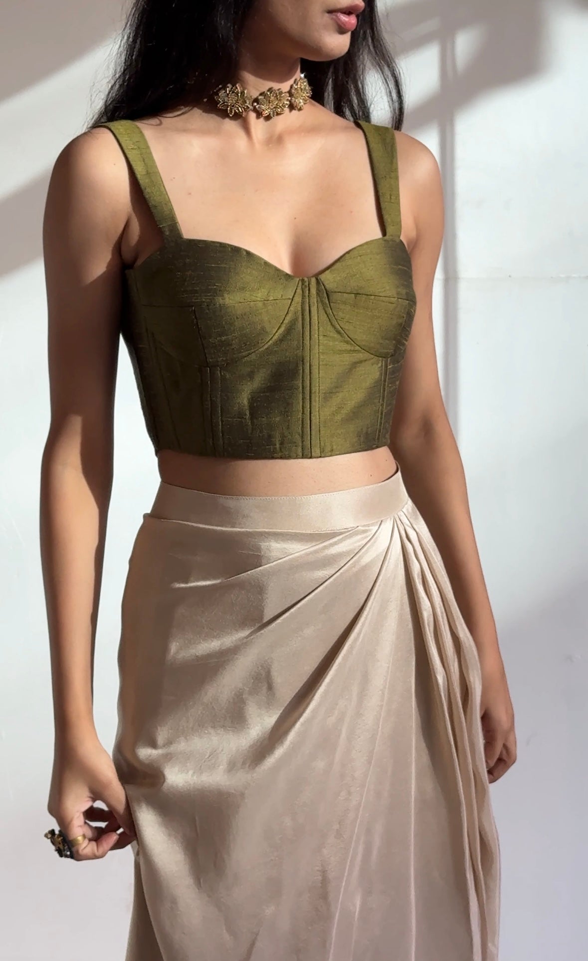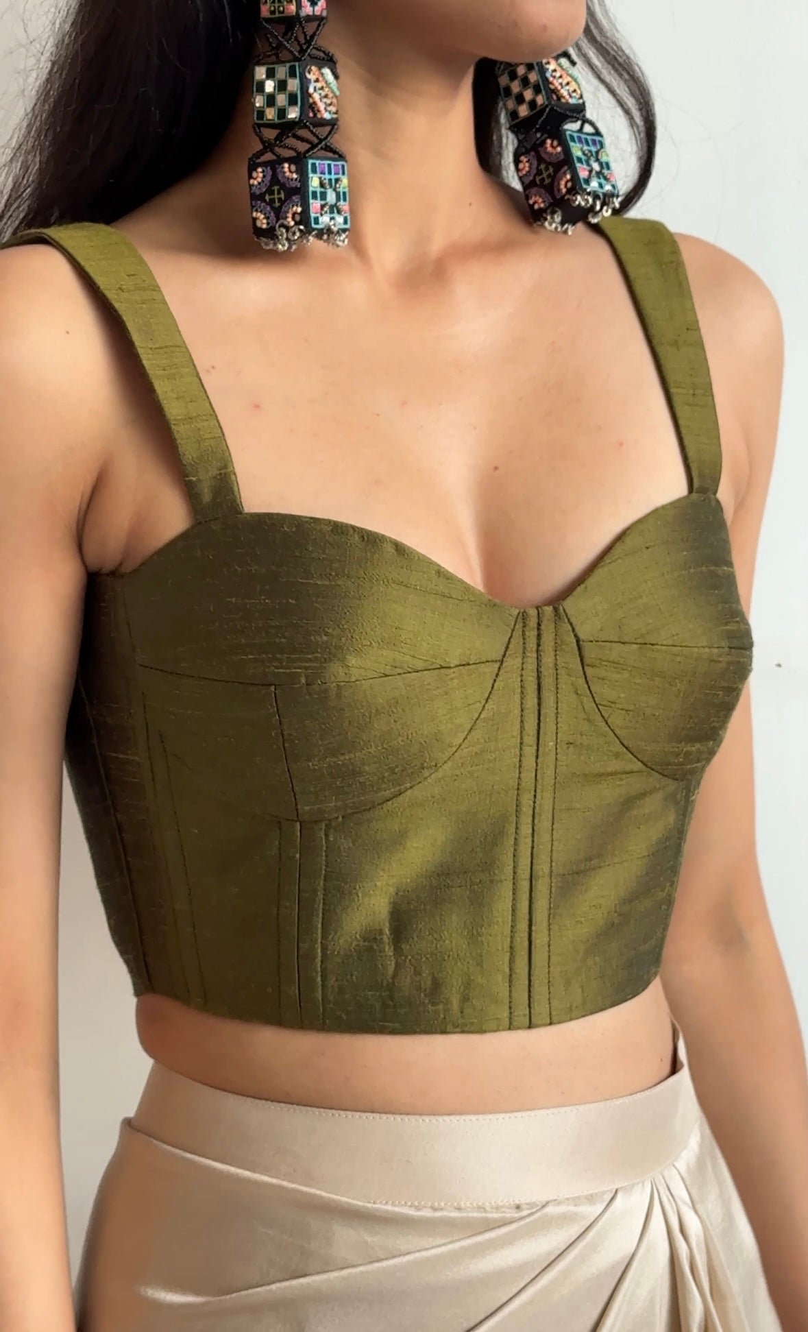 This structured bustier is crafted from pure raw silk fabric. It has boning in the front, padded cups with tapered straps and back zip closure.
