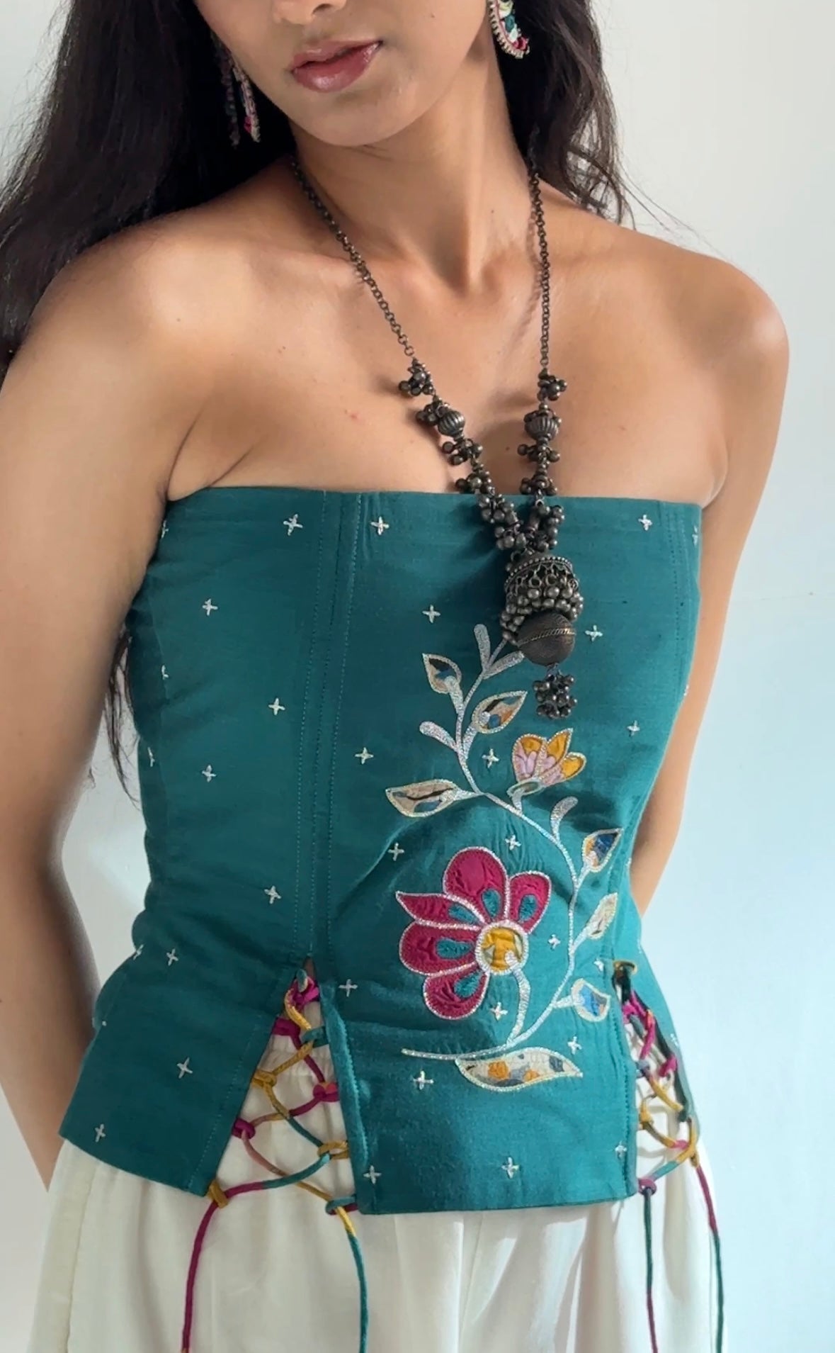 This corset top is crafted from green silk blend fabric. It has hand embroidered applique motif in the front center panel of the corset. It features a sleeveless, structured corset design with minimal stretch and boning details with colorful lace up front and center back zipper closure.