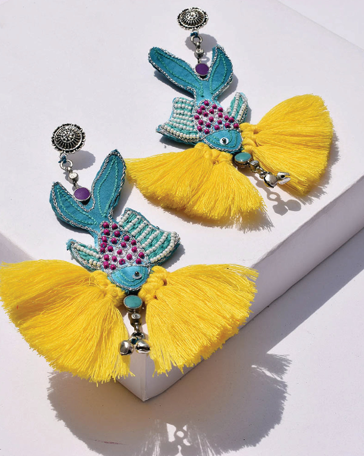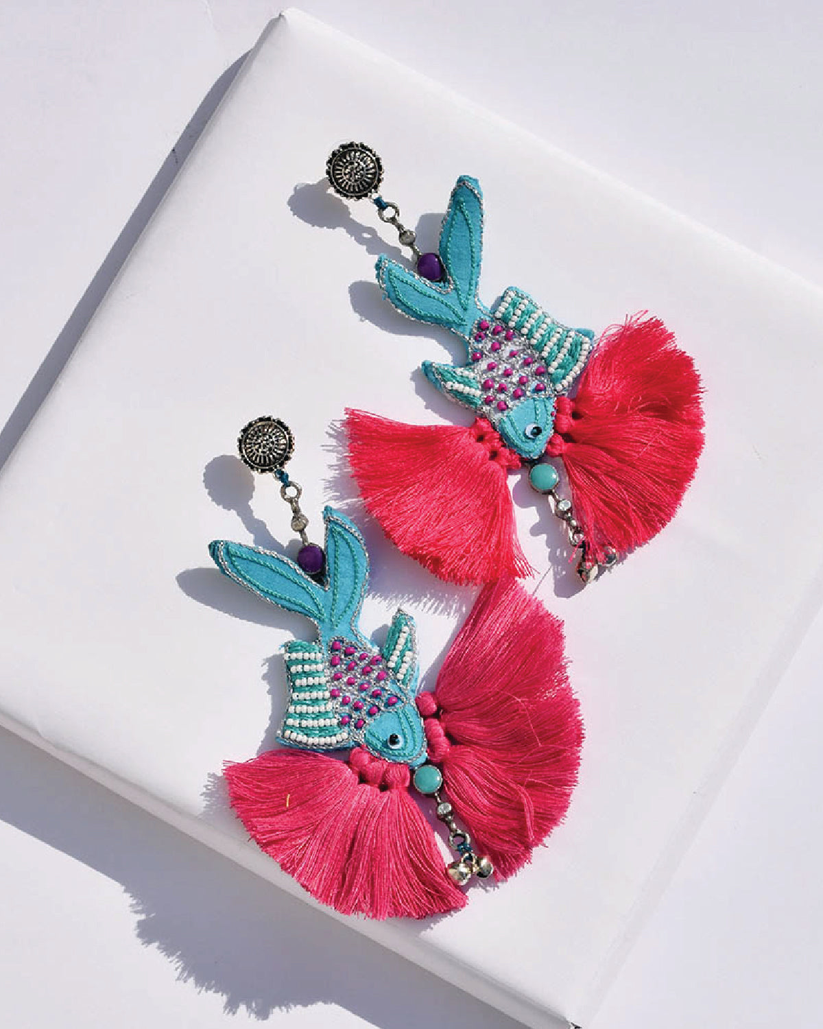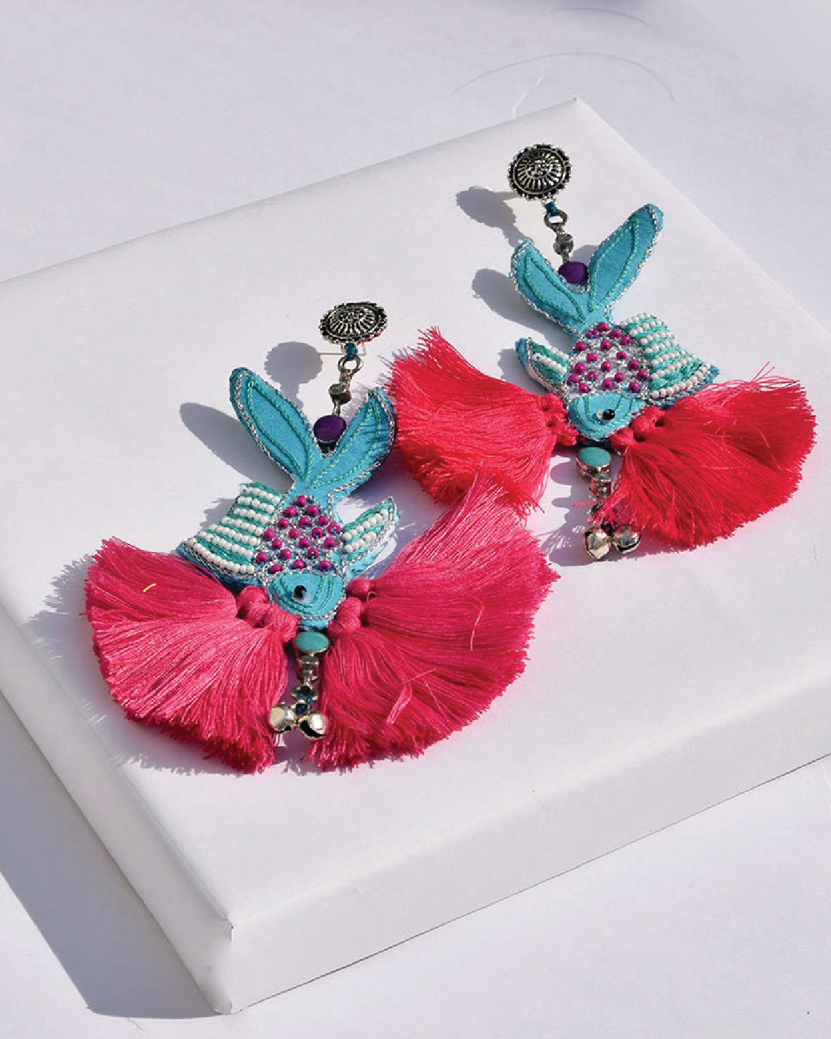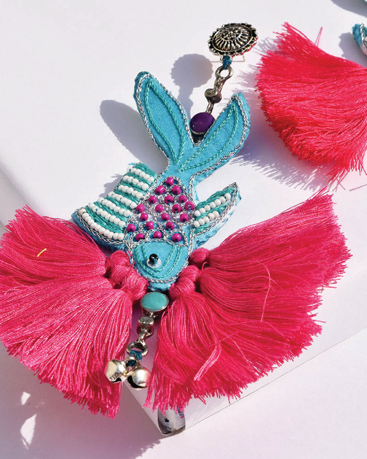 Swim underwater with the fishes this season with our fish hand embroidered earring detailed with pink tassels and blue Meena silver drops.