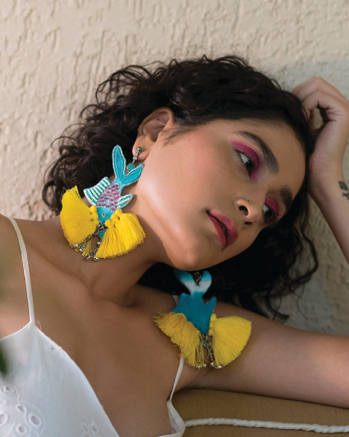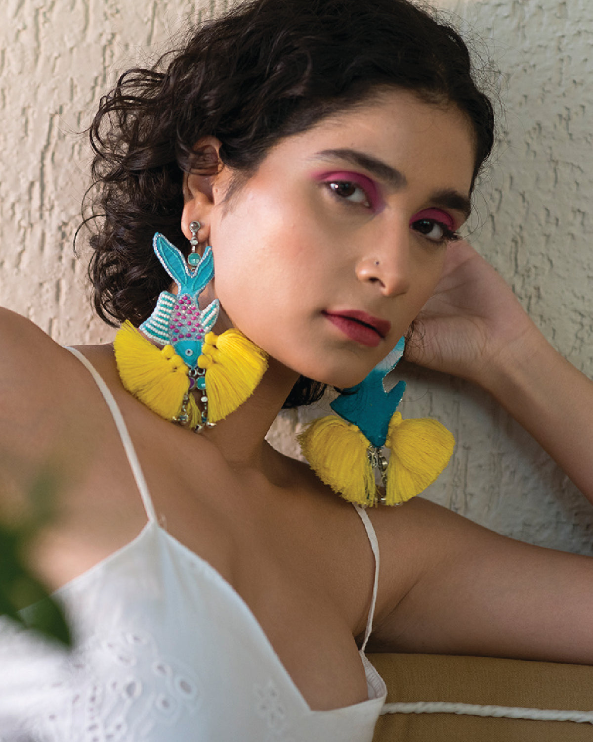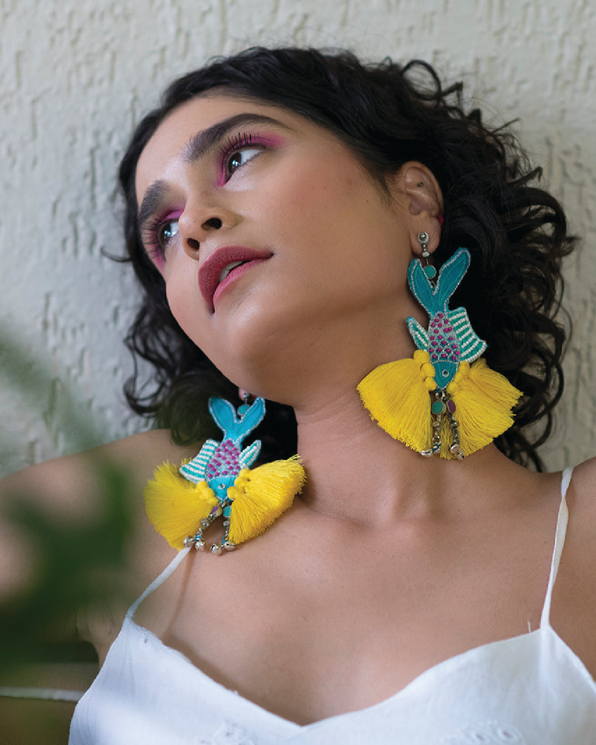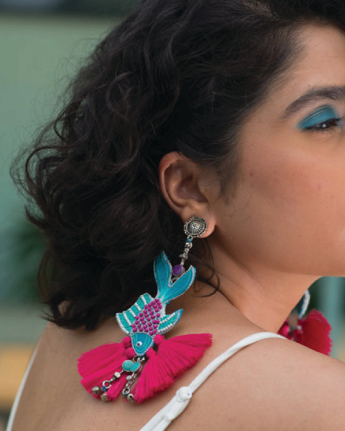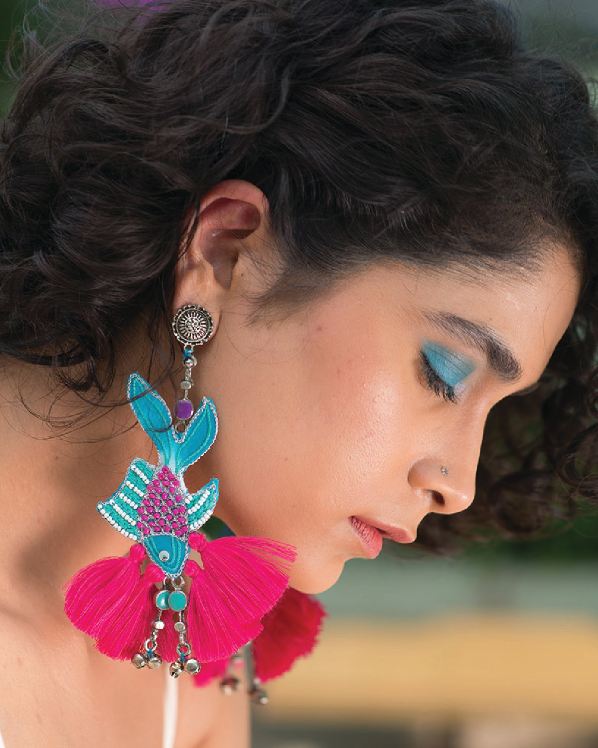 Swim underwater with the fishes this season with our fish hand embroidered earring detailed with pink tassels and blue Meena silver drops.
