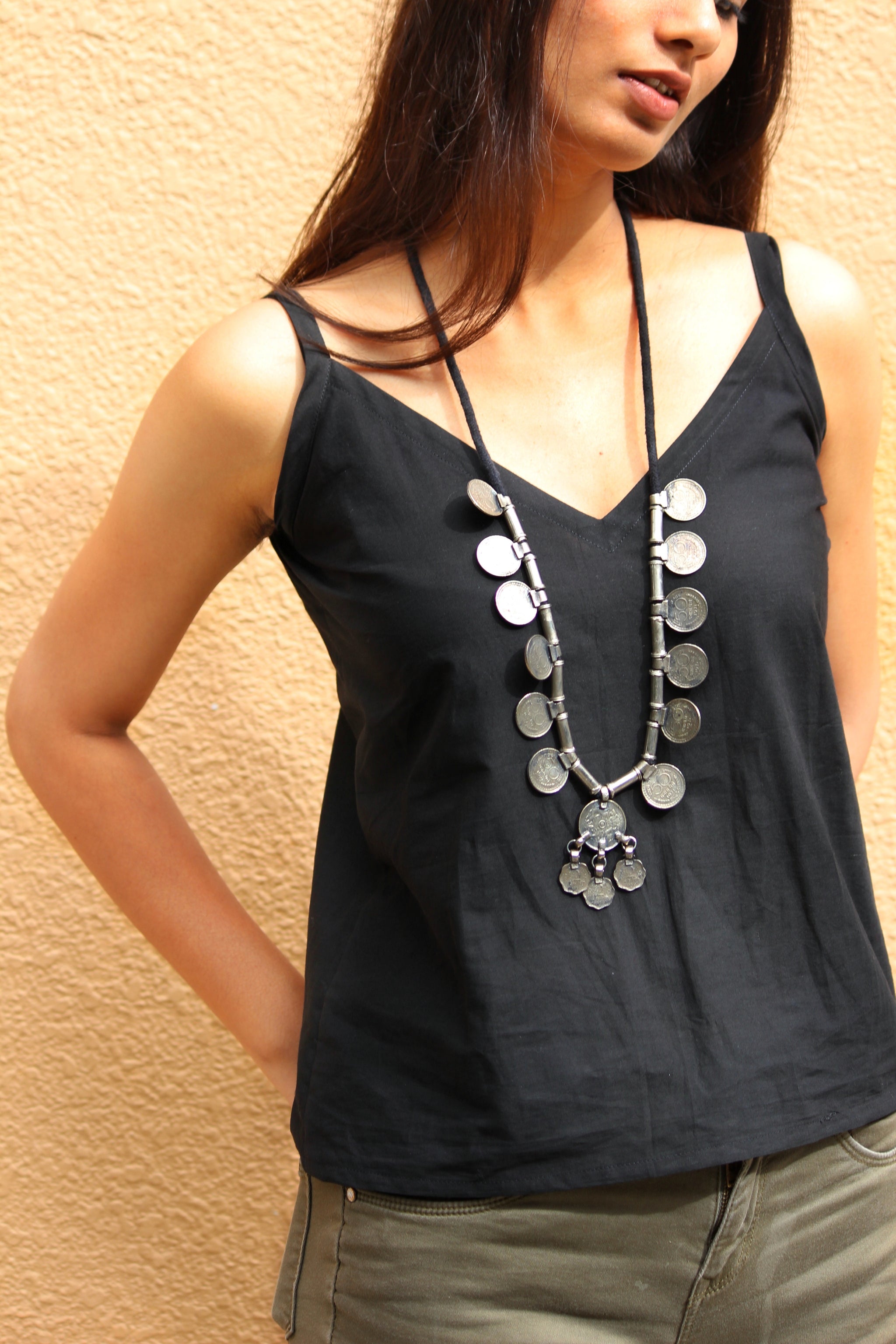 This tribal necklace is handmade and interspersed with metal and vintage coins. A clasp is used for closure.