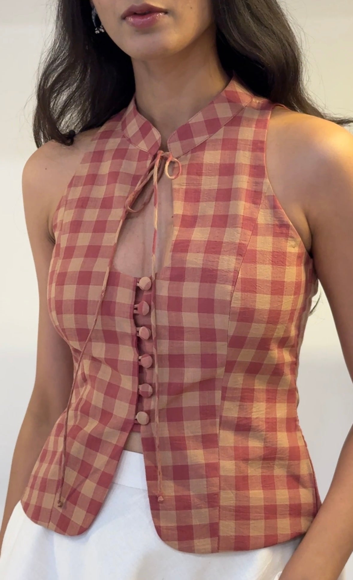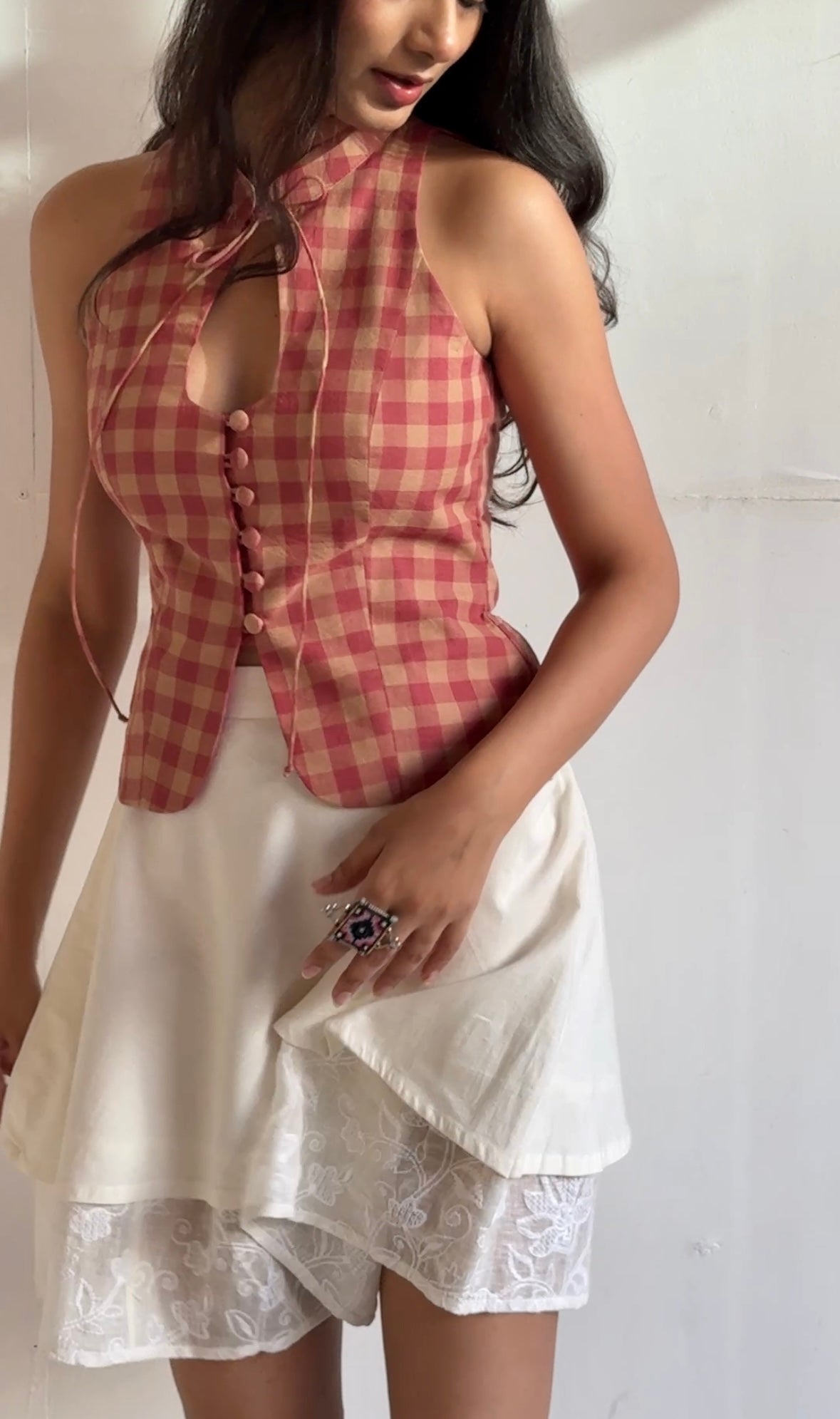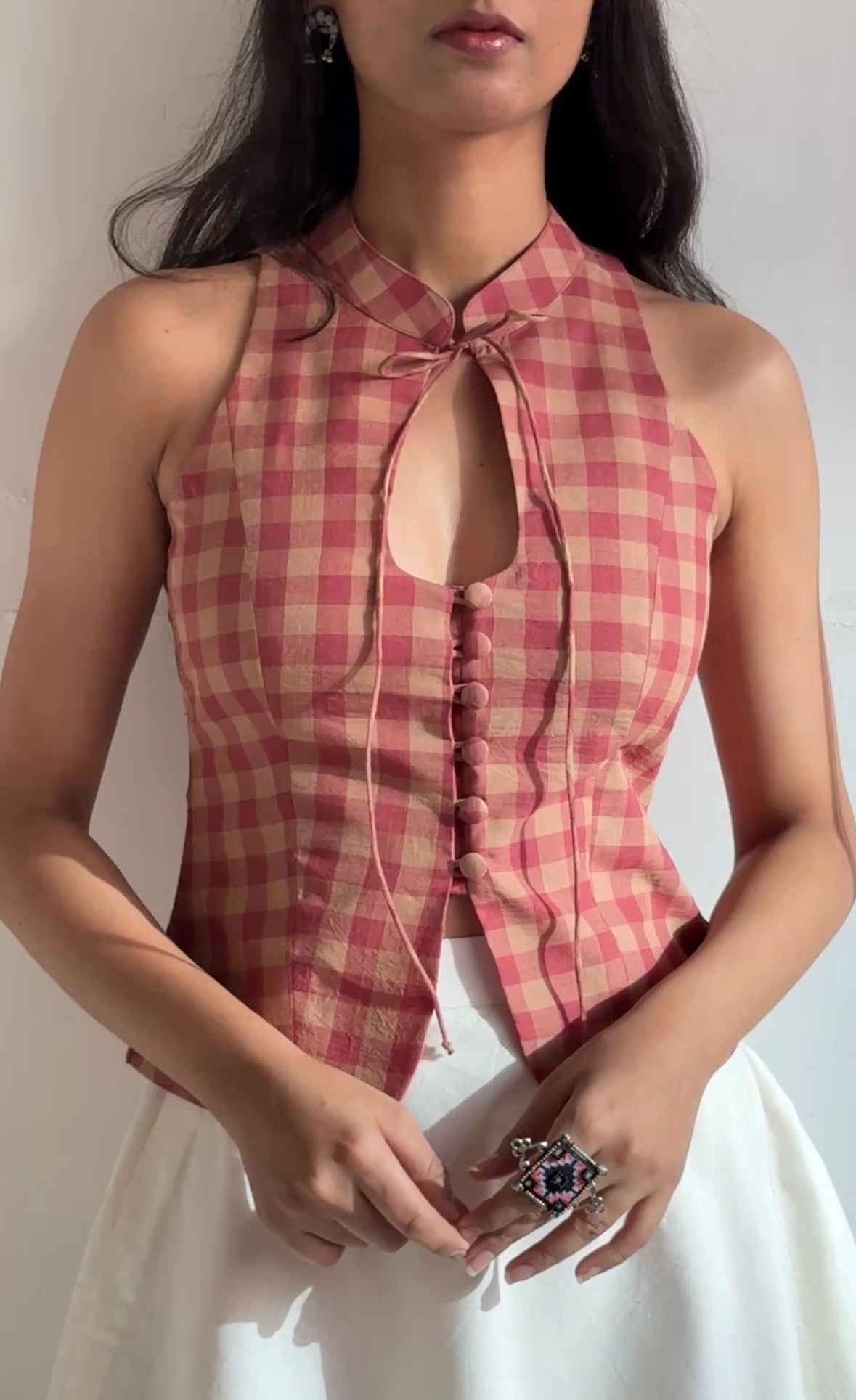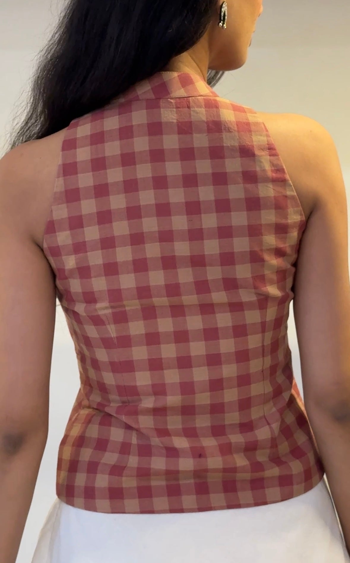 This halter sleeveless top is crafted from woven cotton fabric. It features structured fit with collared key hole design on the neckline. It has front open button closure with slit. It does not come with pads. Model is wearing size XS.