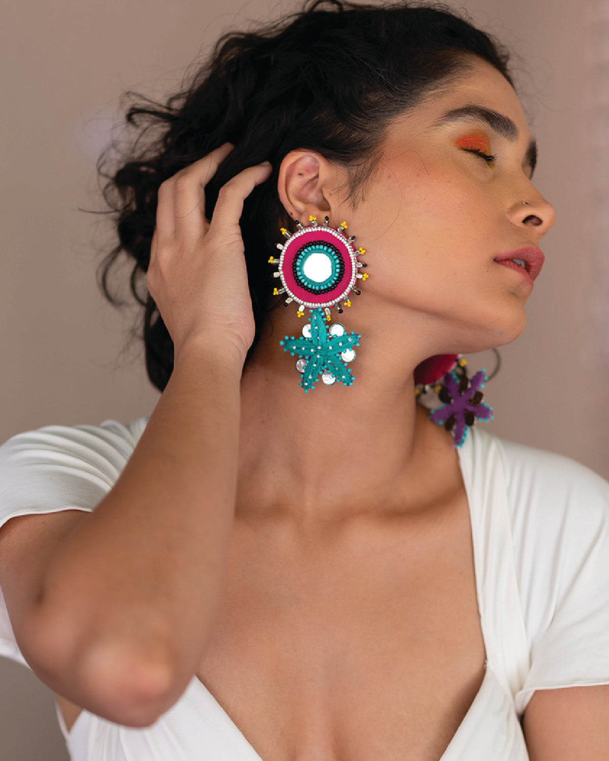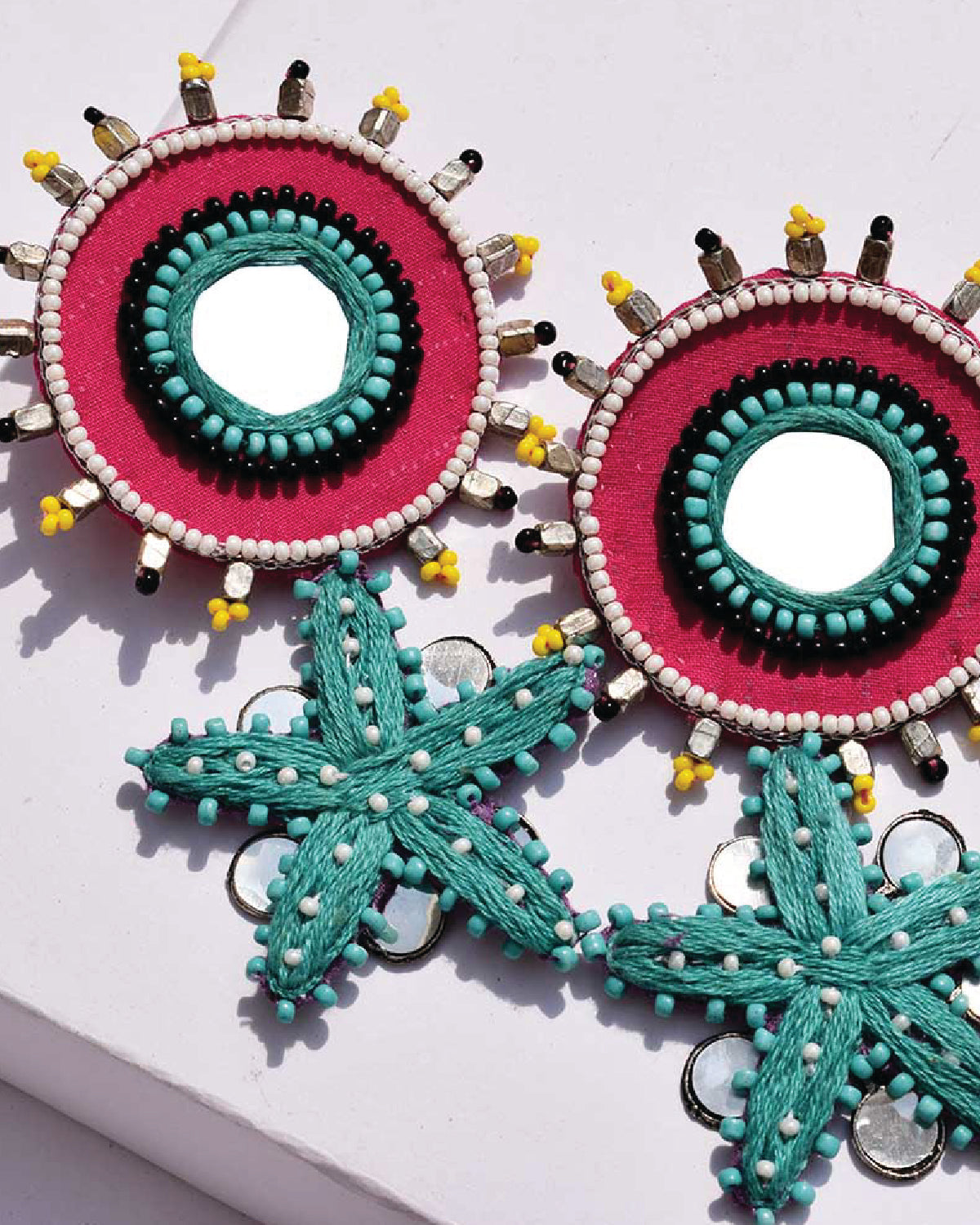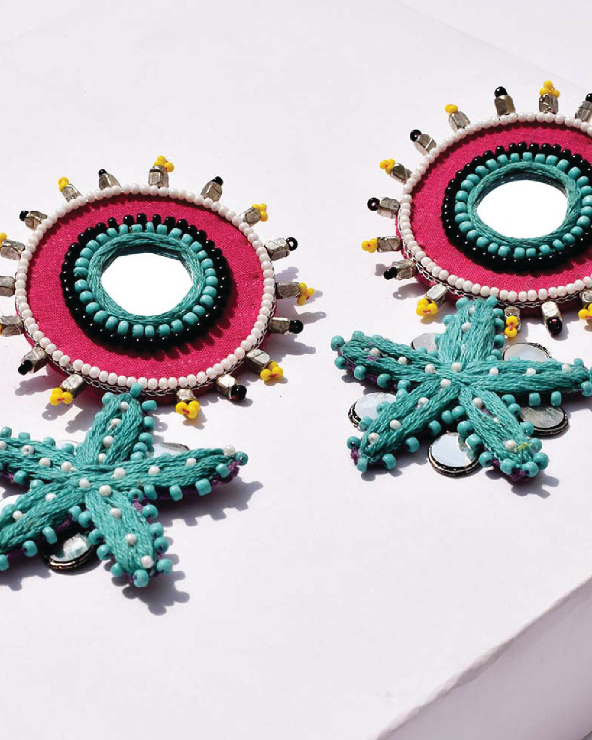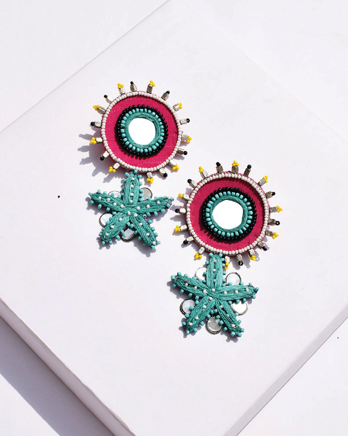 Let your beach outfit be a stand out wherever you go with circle mirror medallion detailed with sea green starfish and silver bolts.