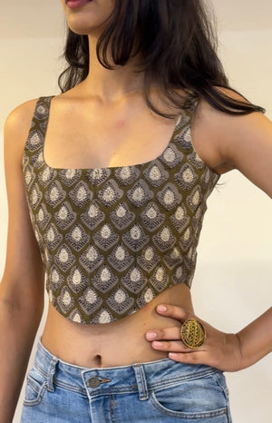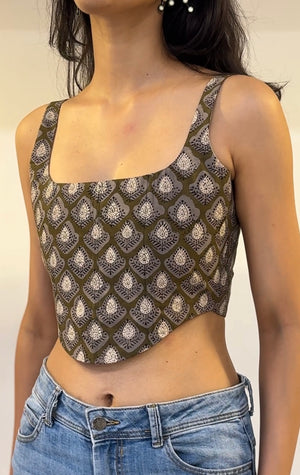 This corset top is crafted from printed cotton fabric. It is a structured corset top with minimal stretch. It features boning details and a back zipper.