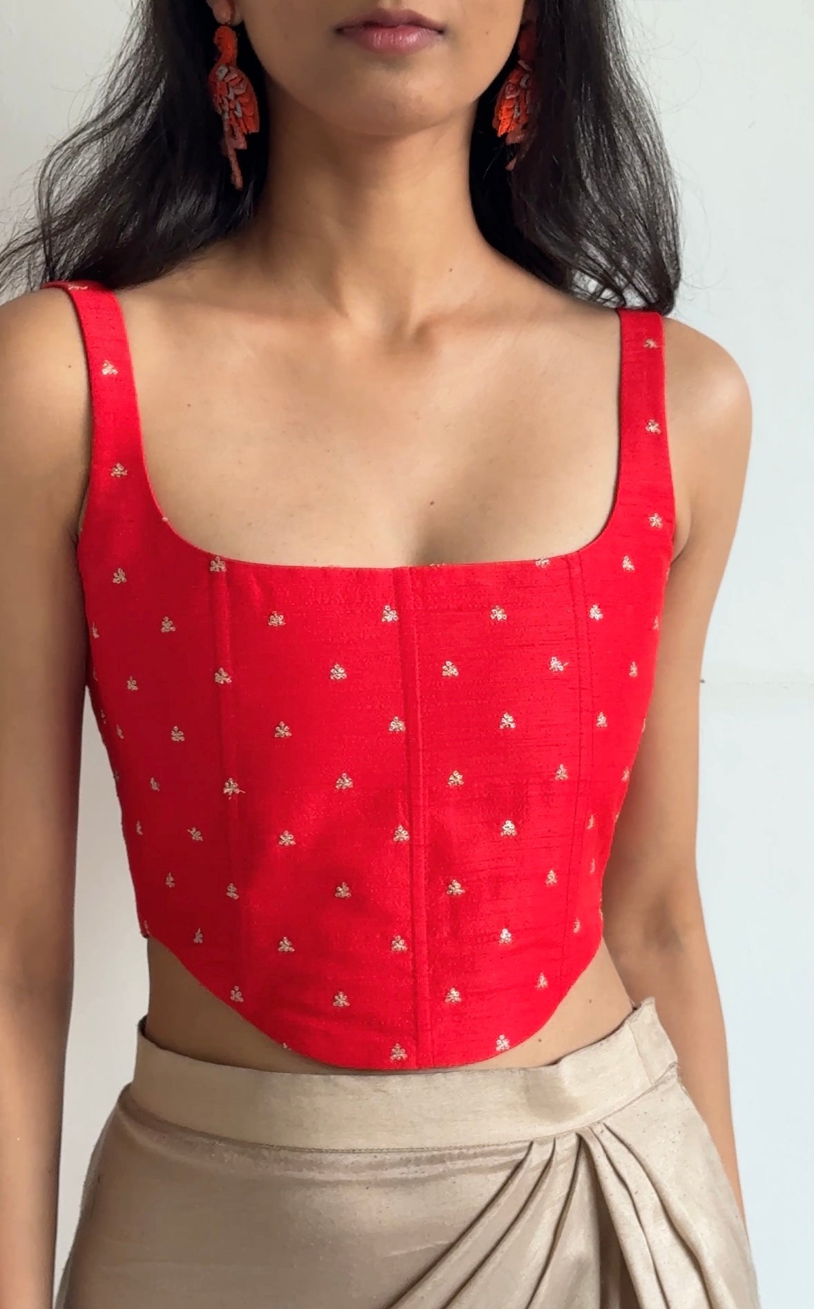 This corset top is crafted from embroidered blended silk fabric. It is a structured corset top with minimal stretch. It features boning details and a back zipper.