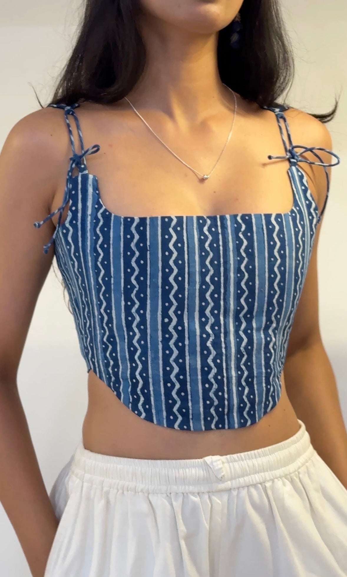 This tie-up corset is made from printed cotton fabric. It is a structured corset top with boning and minimal stretch. It features boning details with adjustable tie-up on the shoulder with zipper on the back. It is not padded.