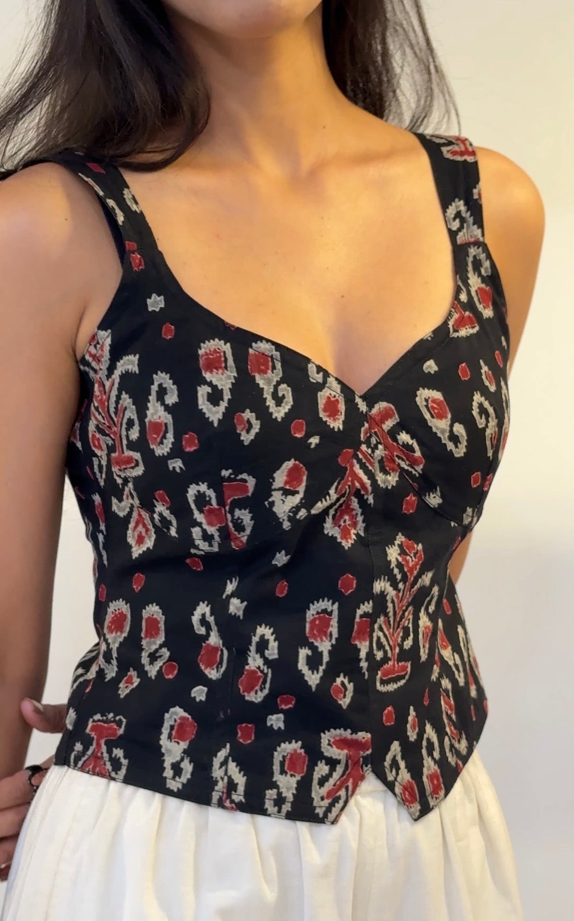 This printed cotton top features a plunge sweetheart neckline with thick strap and a zip closure on the back. It is lined. It does not come with pads.