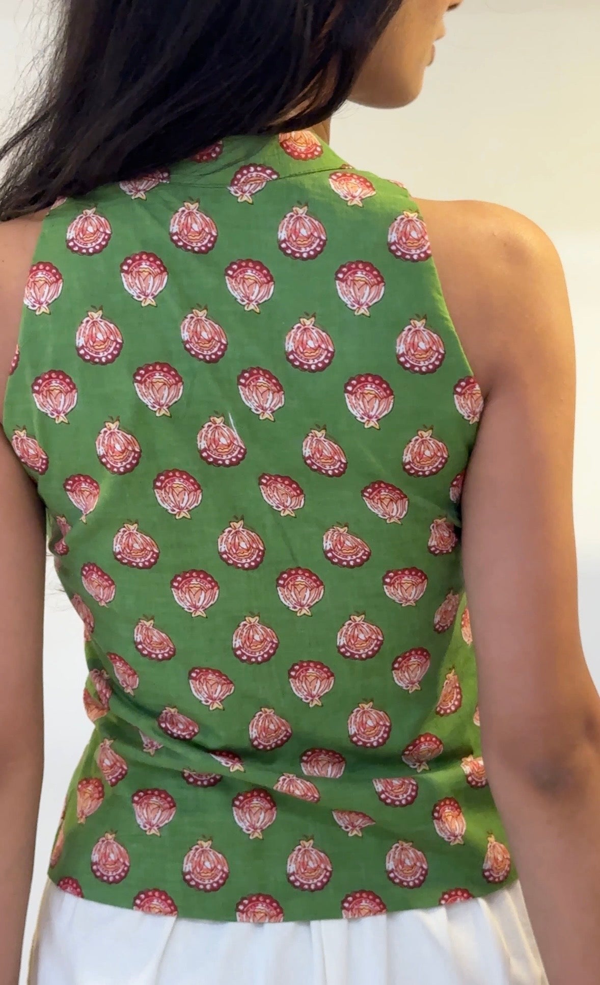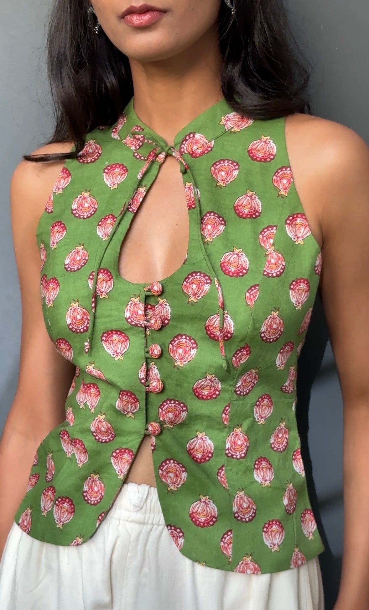 This halter sleeveless top is crafted from block printed cotton fabric. It features structured fit with collared key hole design on the neckline. It has front open button closure with slit. It does not come with pads. Model is wearing size XS.