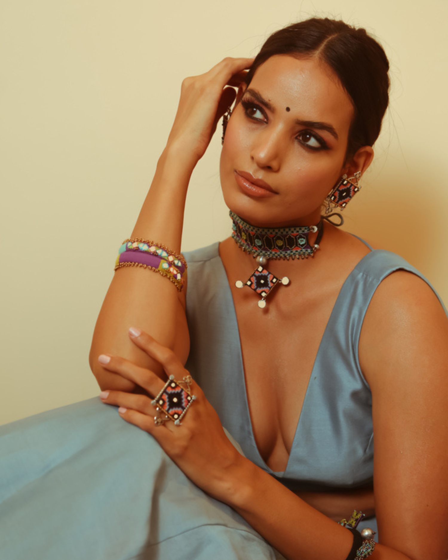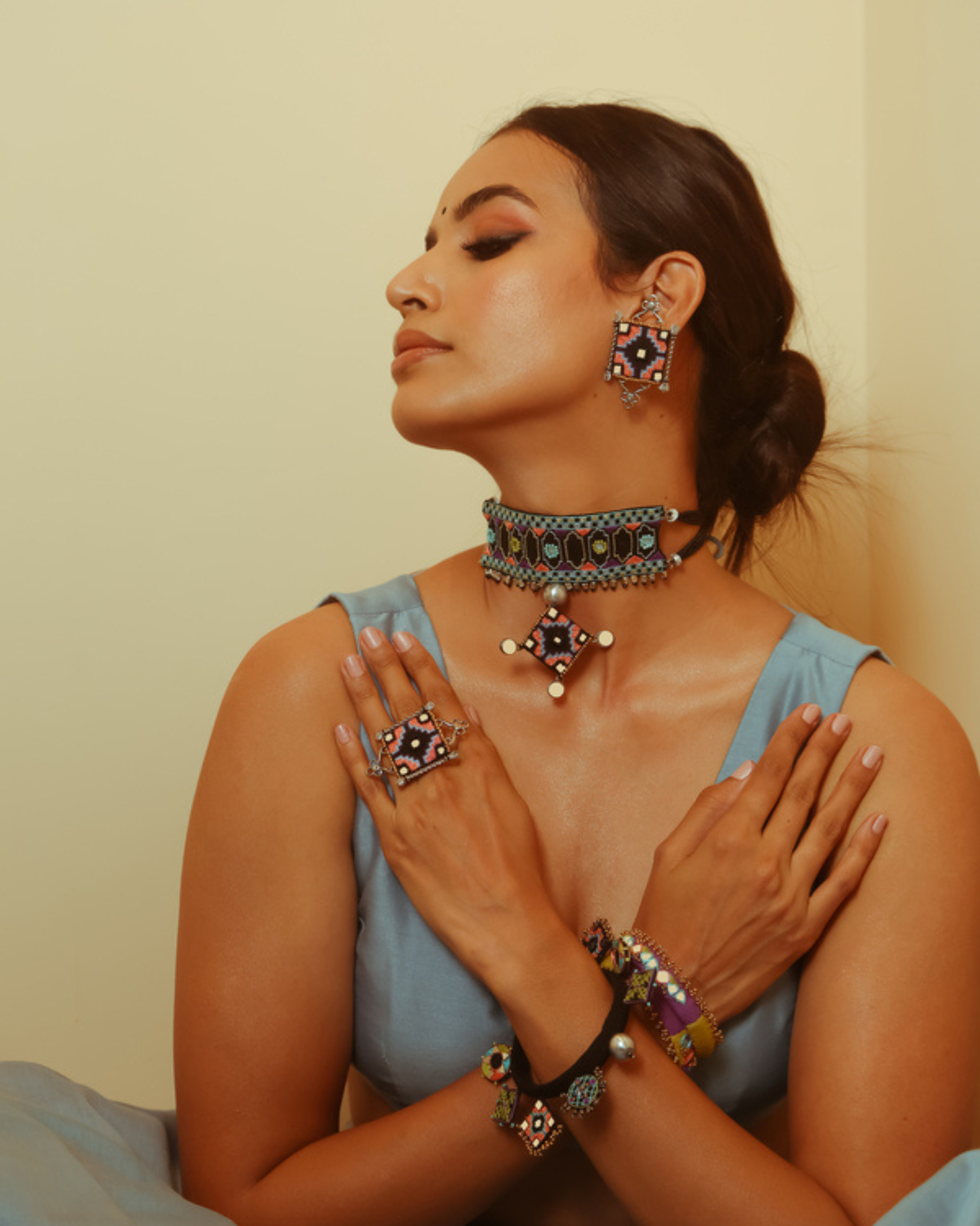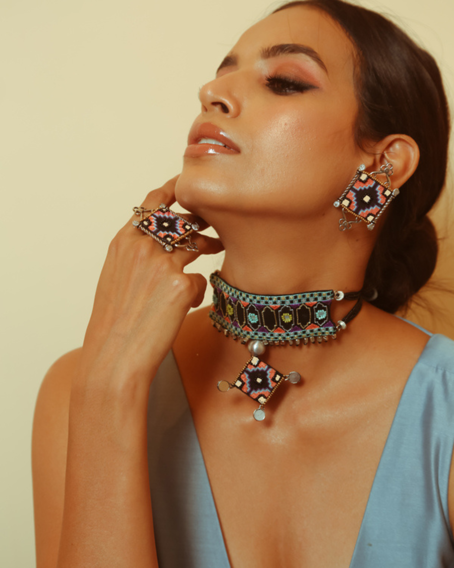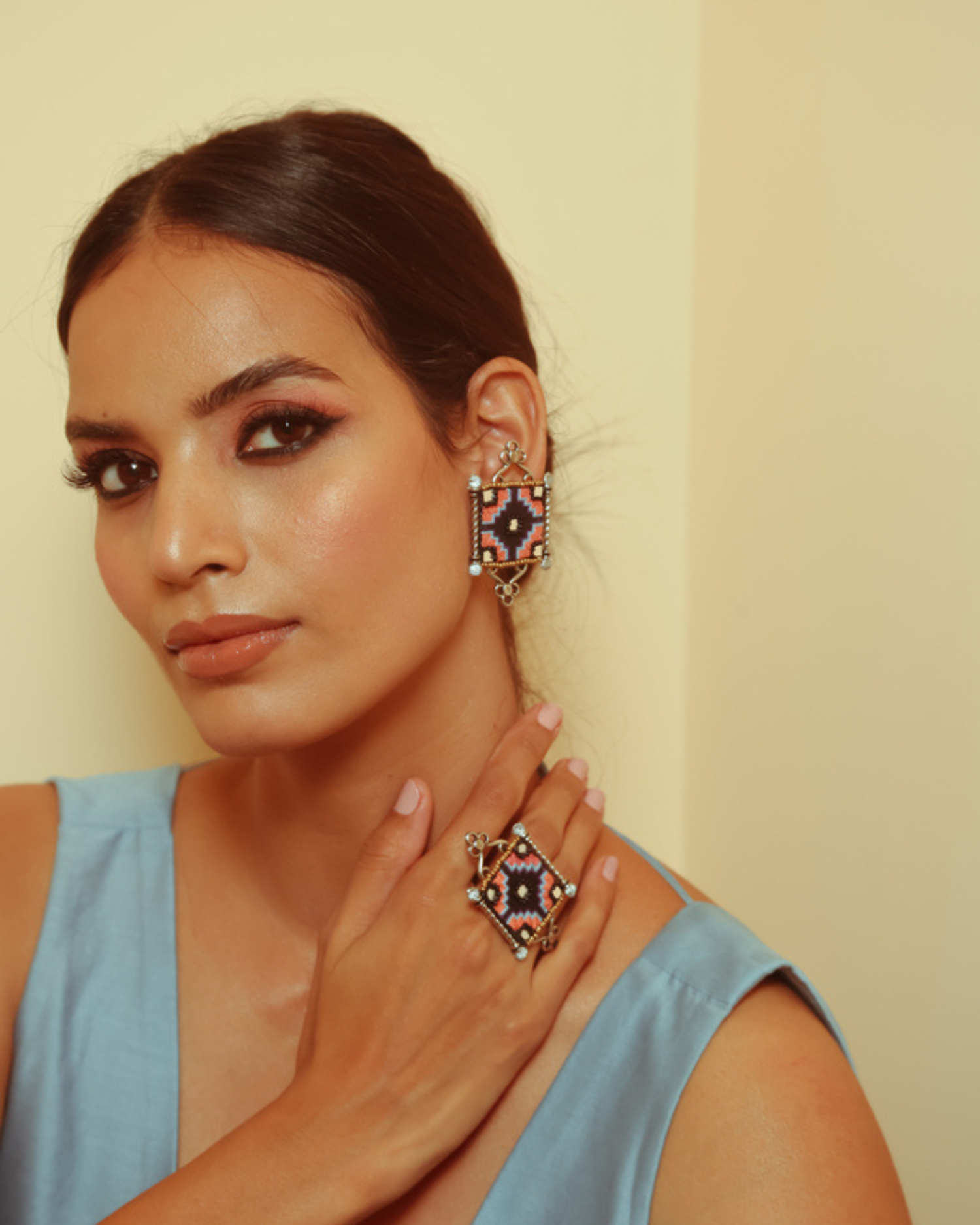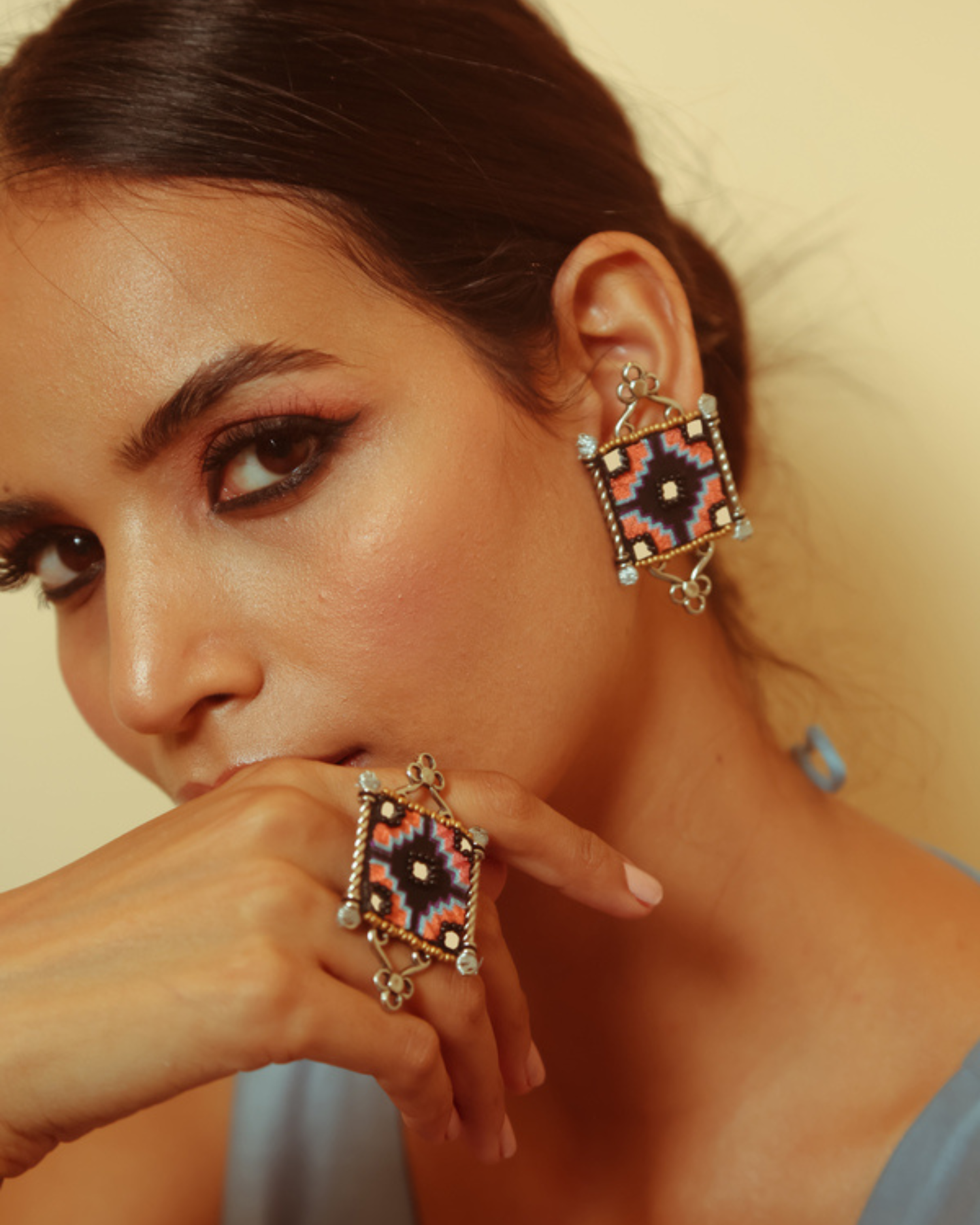 Stud style finger ring that comes with a adjustable free size ring base in silver.